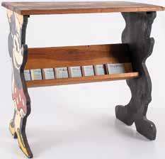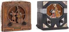 LARGEST: 7 - 1/2” X 5 - 1/4” X 7 - 1/2” CONDITION: (A) A wood construction radio with a tin die-cut graphic of Mickey Mouse in the middle playing a bass violin. Marked for the Emerson Radio & Television Walt Disney. It shows little vignettes in the corners of Mickey Mouse, Pluto, and Goofy. It has original knobs in original paint, with all original chastity. There are areas of paint loss and repainting to the white stripes on the middle. It shows areas of wear, scuffs, and scrapes to the black paint. (Good). (B) An Emerson Mickey Mouse radio, wood-paneled. It shows Mickey Mouse playing a bass violin on the front, Mickey Mouse playing a flute on one side, and Mickey Mouse playing a tuba on the other side. The back is marked with the original Emerson brass label, Emerson Radio & Phonograph Corporation out of New York. It shows the original cord, areas of chips to the wooden overlay components, areas of wear, and original knobs. (Very Good). Both radios are untested. (Good - Very Good). 500 - 1,500