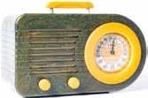 10 -1/2” X 5 - 3/8” X 6 - 1/4” CONDITION: It shows a marbleized green with yellow handle, bezel, and knobs. It has a repair to the bottom-left side, extending from the bottom portion of the grille all the way to the back of the radio. No other, chips, or repairs. It has a cord and replaced back. (Good). 500 - 1,500
