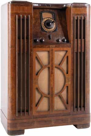 14 - 3/4” X 7 - 1/2” X 7 - 3/4” CONDITION: It shows original knobs, dial with dial glass, worn and torn speaker cover. No back to the radio, has the original cord, and it is untested. (Good). 500 - 1,500