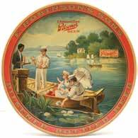 12” Dia. Pre-Prohibition, c. early 1900s-1910s. E. Robinson’s Sons Brewing Co. Beautiful graphics of the waiter serving the men and women in the boat with the E. Robinson’s Sons Pilsner Beer billboard in the background. Incredible graphics throughout. Manufactured by Hausermann Litho, marked on bottom edge. CONDITION: Has some light wear and spidering when held in the right light. Some paint scratching to rim. (8.0). 400 - 800