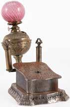 17” X 20” X 26” CONDITION: Showing no breaks or repairs and unsigned. The patina shows some age, the cut glass shade has several hairline cracks, and the lamp is operational. (Excellent). 500 - 1,000