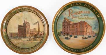 Largest: 13 - 1/2” Dia. x 1 - 1/2” T. (A) C. 1930s Health Beverage Co. factory scene on beautiful pretzel-style tray. Manufactured by the Burdick Co., marked on bottom edge. CONDITION: Clean overall with only some light wear and scratching. (8.75). (B) 13” Old Reading tray. CONDITION: Extremely clean with bright paint and original gloss. Extremely clean example. One mark on rim next to the “I” in “Inc” and some very faint scratching when held in the right light. Difficult to upgrade. (9.0). (8.75), (9.0). 300 - 600