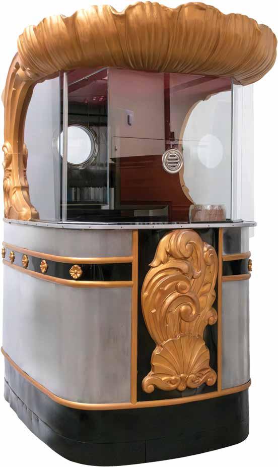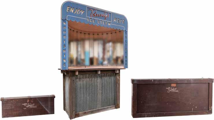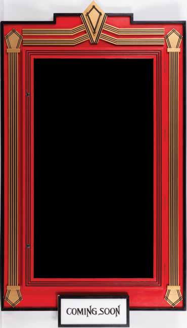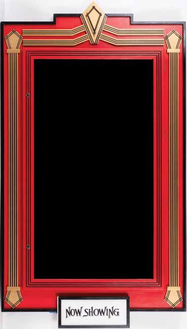 Largest: 50” x 70” x 97”. In the 1960s and 1970s, when many of America’s grand movie palaces were demolished to make way for modern multiplexes, their spectacular Art Deco architecture and fixtures were often lost forever. Only a handful of these ornate Deco ticket booths survived, and this is one of those rare examples. Sourced from a historic theater in the California desert (Palm Springs area), this booth captures the opulence and craftsmanship of cinema’s golden era. It features sweeping Deco curves, gilded appliqué details, and curved glass panels, making it a nostalgic and conversationworthy centerpiece. CONDITION: Showing very little wear, no breaks or repairs noted. Glass is intact, backdoor is operational, and ready for a multitude of decorating applications. This rare survivor has been professionally restored and repainted, and today makes an extraordinary statement piece, ideal as a home bar, theater display, or lobby installation. This is not a standard shippable item and will require 3rd party shipping or pickup arrangements to be made. (Very Good). 10,000 - 30,000