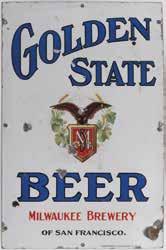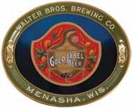 16 - 3/4” X 13 - 1/2” Oversized oval Gold Label Beer tray. Beautiful dark reds, blues, and golds. Reads “Brewed from Selected Malt Best Imported Hops”. Very graphic and well-done tray. Reads “Walter Bros. Brewing Co. Menasha, Wis”. Maker marked “The H.D. Beach Co. Coshocton, Ohio”. CONDITION: Has some slight edge consistent with age and use. (Excellent Plus). 400 - 1,200