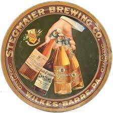 12 - 1/2” Dia. C. early 1930s. Stegmaier Brewing Co., Wilkes-Barre, Pennsylvania. Stegmaier’s Beer Ale Porter factory scene beer tray. Pretzel-style tray, difficult to find. Manufactured by the Burdick Co., trademark marked on bottom edge. CONDITION: Solid example with solid paint. Has some light scratching and wear on the face. (7.75). 400 - 800