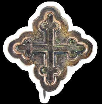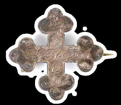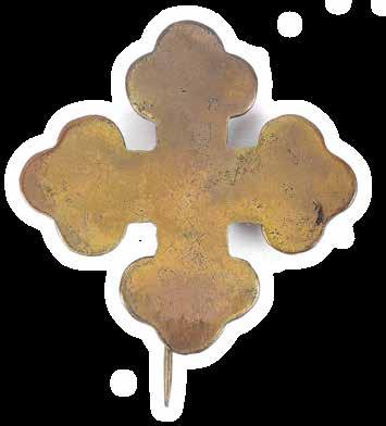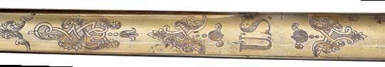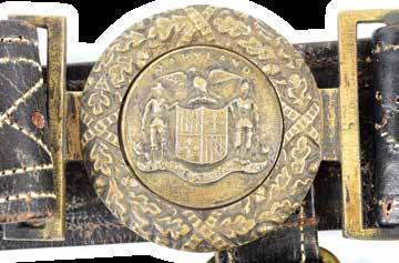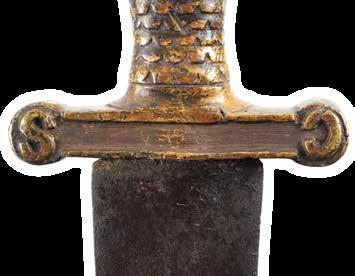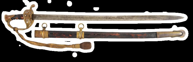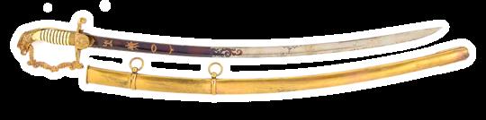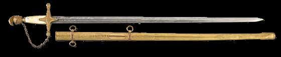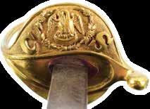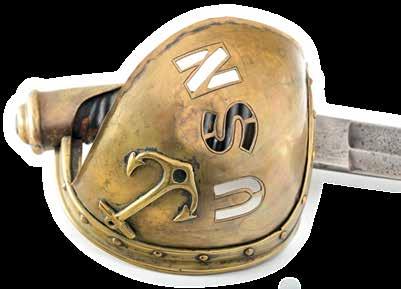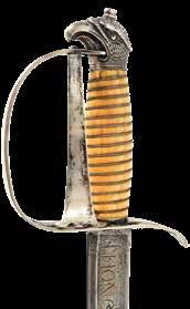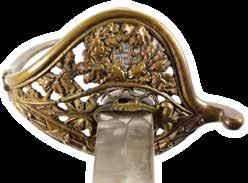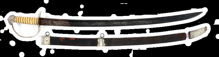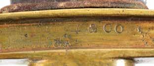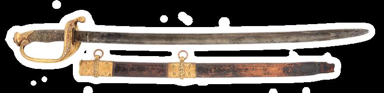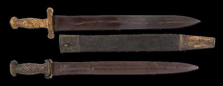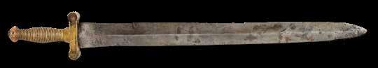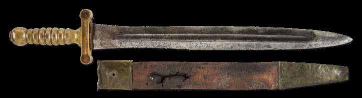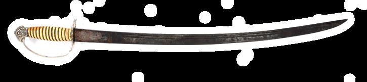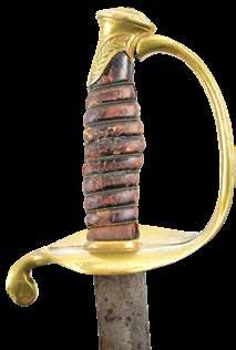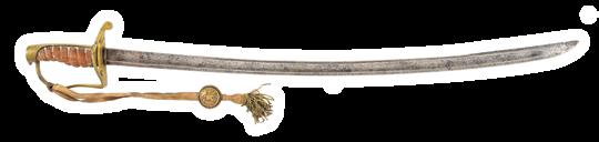 For a nearly identical example, see plate 331.S on pg. 172 of “Swords & Blades of the American Revolution” by George C. Neumann. These open pierced-guard sabers resemble the hilts of weapon wheel swords. The saber features a Spanish-style curved blade with 3 fullers. Due to the crudeness of the fullers, the blade is most likely an American copy. Crossguard with open heart shaped designs on either side of the grip. Counterguard is slightly curved and terminates with a small circular quillon. The D-shaped knucklebow connects to the ball pommel above the pedestal base. Thick brass capstan atop the ball-shaped pommel. Grip appears to be maple. CONDITION: The blade has a mostly even gray patina with scattered areas of darker spotting. Hilt has a pleasing mustard patina with. Grip shows some minor scattered marks and a hairline age cracks bottom. This sword is featured on pg. 346 of “American Silver-Hilted, Revolutionary and Early Federal Swords, Volume I” by Dan Hartzler. 2,500 - 5,000