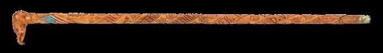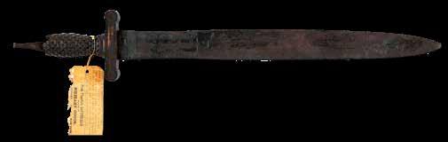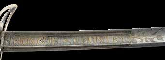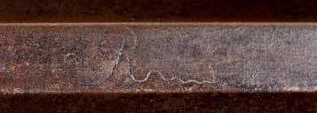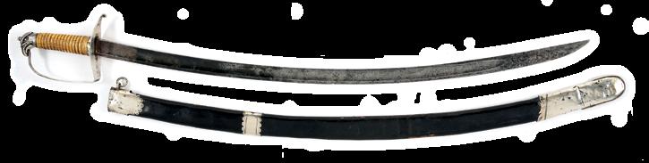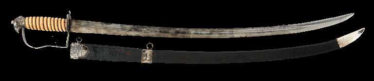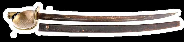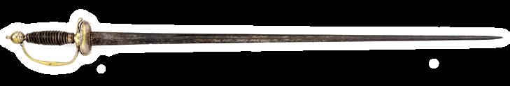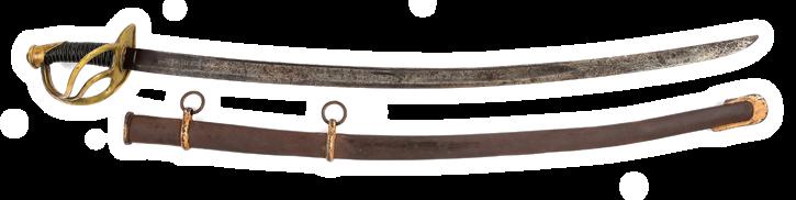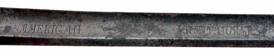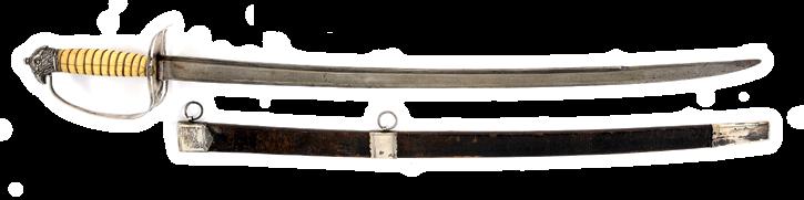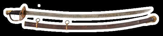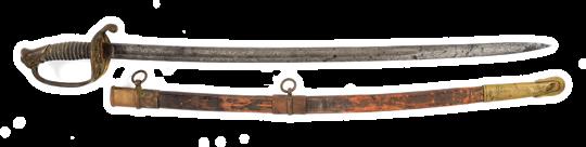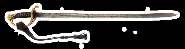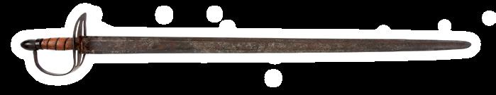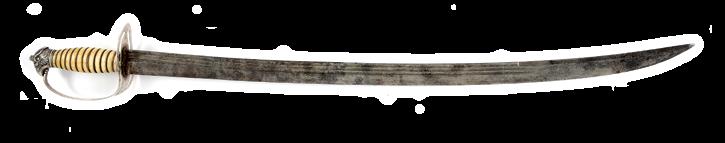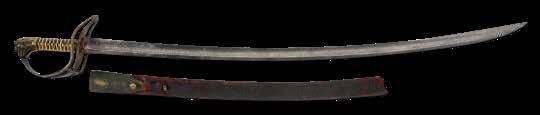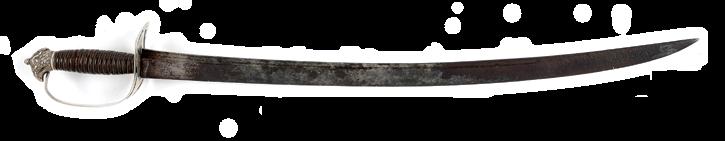These sabers were usually crafted with iron or brass hilts and were used by light cavalry. The saber features a broad, straight blade with double fuller and a 6” false edge. The upper fuller is deep and spans most of the length of the blade. The secondary fuller is broad and shallow. The 4-slot iron crossguard with D-guard connects to the lemon shaped, high dome pommel. The grip is of yellow pine, featuring deep spiraled grooves. Leather wrap and brass wire once covered the grip. Iron ferrule at both ends. The maker of this sword almost certainly saw examples made by James Potter of New York; Potter was a prolific maker of cavalry sabers for loyalist troops. CONDITION: The blade has a brown heavy patina, tip rounded. Guard and pommel exhibit a matching patina. Ferrules are loose due to lack of leather wrap, but hilt is tight to blade. Grip shows some scattered chips and age cracks. This sword is featured on page 350 of “American Silver-Hilted, Revolutionary and Early Federal Sword,s Volume I” by Dan Hartzler. 2,000 - 4,000