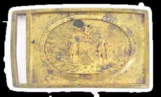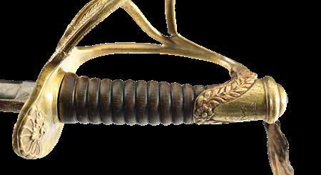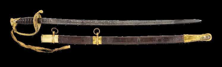 For a nearly identical example, see plate 331.S on pg. 172 of “Swords & Blades of the American Revolution” by George C. Neumann. These open pierced-guard sabers resemble the hilts of weapon wheel swords. The saber features an unfullered American manufactured blade that is nearly straight. Crossguard with open heart shaped designs on either side of the grip. Counterguard is slightly curved and terminates with a small circular quillon. The D-shaped knucklebow connects to the ball pommel above the pedestal base. Thick brass capstan atop the ball-shaped pommel. Grip appears to be maple and there is a thin brass ferrule at base of grip. CONDITION: The blade has a gray patina with scattered brown spotting. A couple battle nicks to edge. Guard has a pleasing dark mustard patina. Grip very good with a couple marks from use and a thin hairline crack. Hilt slightly loose to blade. A similar example is featured on pg. 346 of “American Silver-Hilted, Revolutionary and Early Federal Swords, Volume I” by Dan Hartzler. 3,000 - 5,000