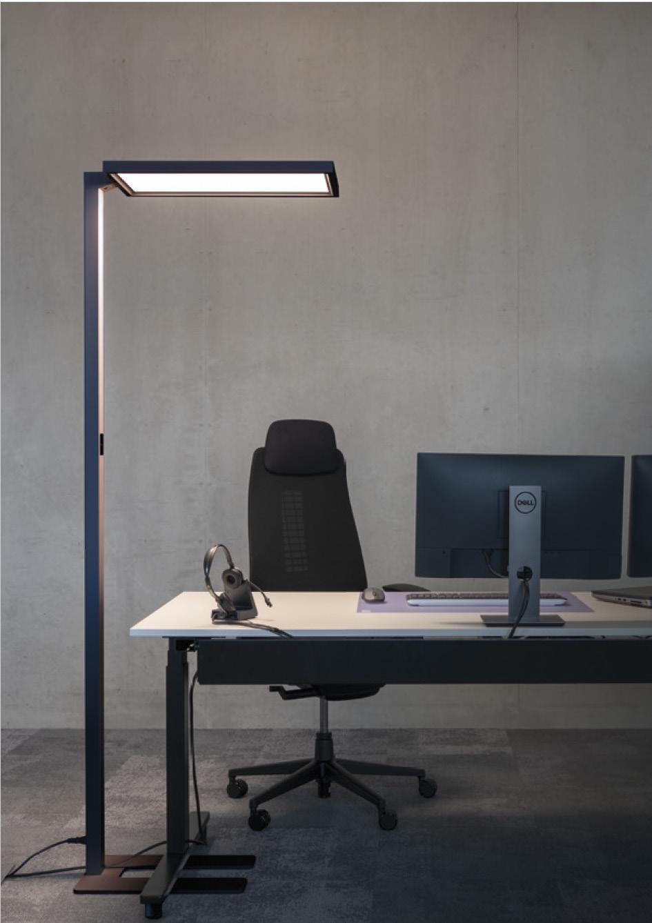 Moderne, kraftfull og allsidig: WORKLIGHT PRO gulvlamper dekker alle belysningsbehov i et moderne kontormiljø. Det særegne er den flate lampehodet med prismatisk optikk, som gir mulighet for separat styring av direkte og indirekte lys. Dobbelvarianten med to lampehoder og en lysstyrke på opptil 20 000 lm sørger for optimal belysning av doble arbeidsplasser med kun én lampe. Når pultene flyttes, følger