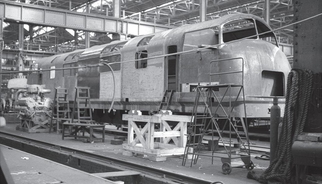 A well-known view of D800 under construction, 15 September 1957, complete with chalked DB V200-style speed whisker! Construction of the first three, the actual ‘Pilot Scheme’ examples, was protracted because (as has been pointed out in various published works) D800 was practically hand built, with each jig fashioned alongside as the loco took shape. The Railway Observer noted the new diesels under construction amid various 9F 2-10-0s on 3 November 1957: ...new construction included Maybach diesels D800 with engine alongside and D801/2 bodies complete... German technicians and engineers were frequently present and at least one married a local girl and stayed in England.