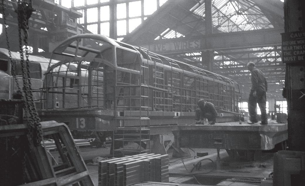 This would be D818 according to that buffer. In a remarkable procedure the outer skin was pieced together by welding until each side, cab door to cab door was complete; it was then mated up to the framework before being welded on. After this was complete the openings for the windows and so on were cut out. All slackness and play in these side sheets was removed through thousands of spot welds an inch or so apart. The dynastarter for this end is visible in the nose.