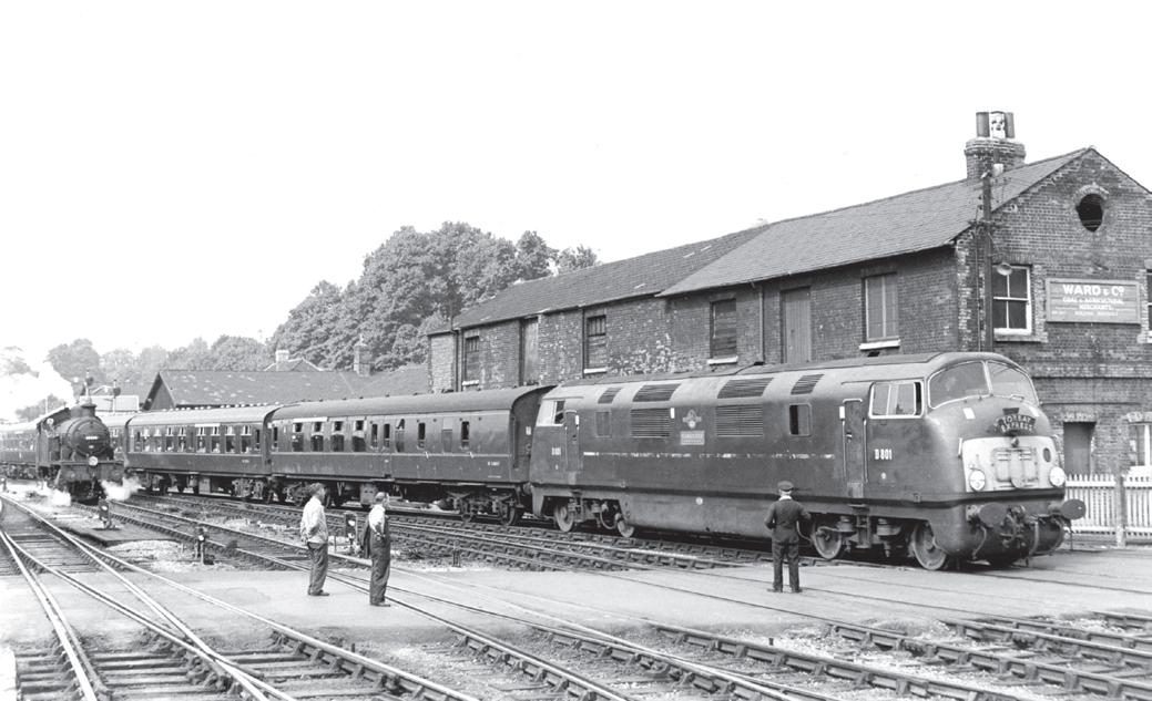 1964 it was announced that the D1000s were to be moved to the PaddingtonBristol and Paddington-Plymouth services, displacing Warships which would release them for other duties including dieselisation of the Southern Region Exeter-Salisbury-Waterloo route and Bristol-Plymouth freight workings. Trials and crew training began in March 1964 with D827 KELLY and a 12-coach rake of empty stock. D829 MAGPIE arrived at Salisbury for crew training at the beginning of June 1964 and was replaced after a week by D819 GOLIATH. Three return trips each day were made to Basingstoke using a train of thirteen condemned coaches. Was this laudable economy or a reflection of the WR’s attitude to its new possession? Full introduction of Warships (the Swindon variety) came on 17 August 1964. While at Waterloo the locomotives were stabled in the Windsor line carriage sidings far out on the Windsor side where they could be distantly spied. Sometimes they didn’t seem to move a lot...