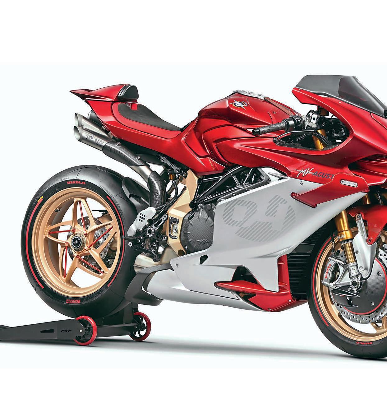 But it’s the styling that catches you, particularly the mad aerodynamic wings. MV Agusta actually experimented with wings on a prototype 500 GP racebike in 1973, with a wild top fairing that bears more than a passing resemblance to modern versions like the Aprilia RSV4 and BMW M1000 RR. On the Serie Oro 1000 Superveloce, the wings claim to add a hefty 39kg of downforce to the front end at 200mph, while also improving cooling air ow and dropping the engine oil temperature by 3°C. There are also cool carbon front disc covers with a subtle air scoop integrated, so they look