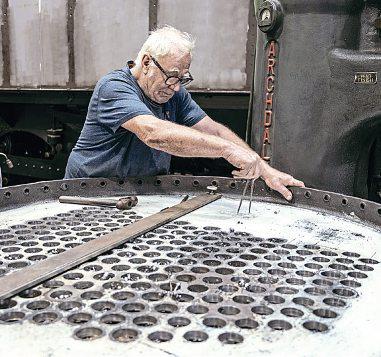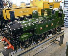 A new front tubeplate for GWR 0-6-0ST No. 1363 is being manufactured at Didcot as an integral part of its boiler restoration. Boilersmith Pete Gransden is working on the smokebox side of the tubeplate marking out where the hole is to be drilled for the regulator box. Holes for the small tubes have already been drilled. Dating from 1910, the five-strong 1361 class were the last saddle tanks built at Swindon; No 1363 is now the sole survivor of all the hundreds of saddle tanks built there. FRANK DUMBLETON