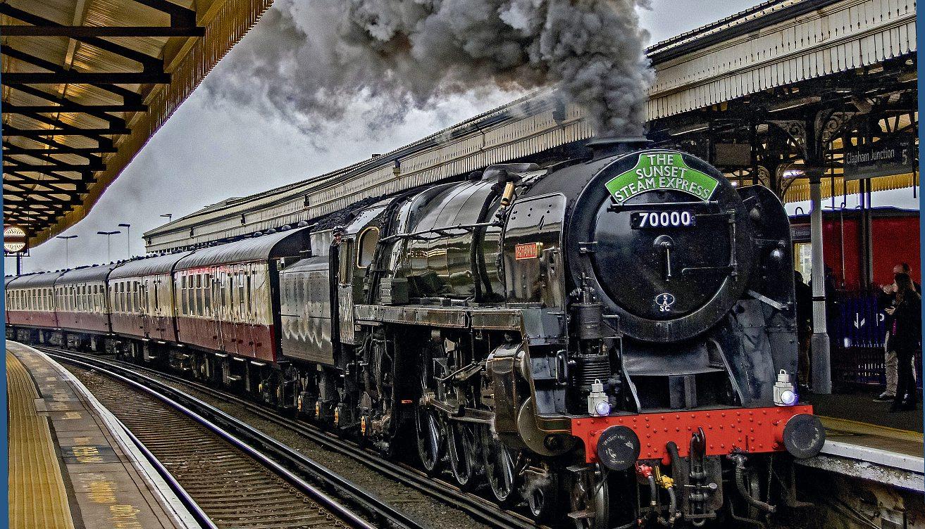 COVER: BRstandardclass7PNo.70000 Britannia storms throughPlatform5atClaphamJunctionwithStreamDreams’ ‘SunsetSteamExpress’onAugust8,withthetourcontinuing onacircularroutethroughtheSurreyHillstoChertseyand return. JOHNTITLOW