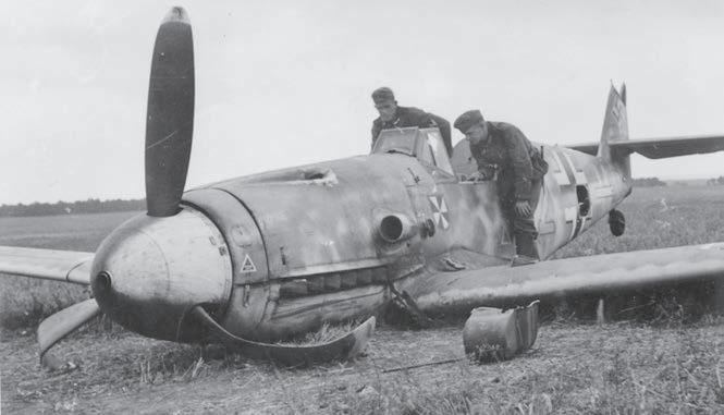 “On May 13, I was scrambled against the Americans by day once again. e P-51s had soon split up our formation and I found myself again caught up in a dog ght, this time over Neubrandenburg. Everything happened so quickly. Several impacts shattered my canopy and slammed into my instrument panel – instinctively I threw my machine into a spin. Recovering some 2000m lower down I noticed that my ying suit was soaked in blood and I had no feeling in my right leg. Seconds later the engine juddered to a standstill. Luckily there were no Americans in the sector and I managed a wheels-up landing in a corn eld at Nienendorf… We were at a loss to understand how our commanders could send us up against P-51s...”