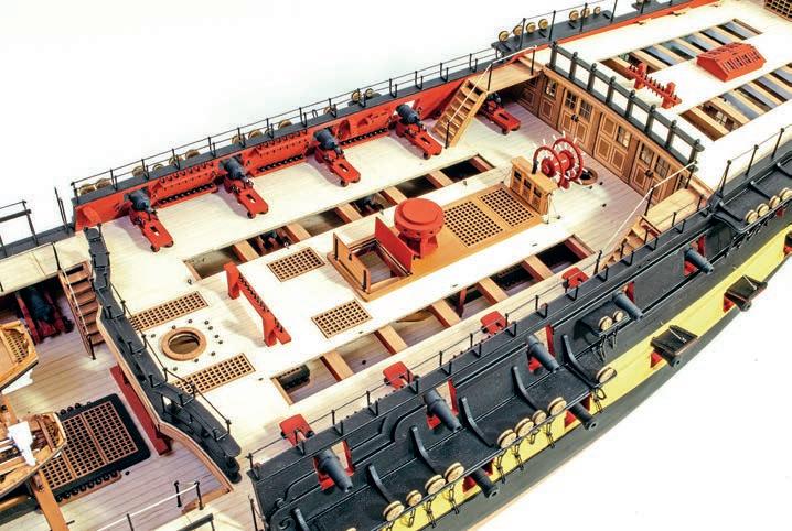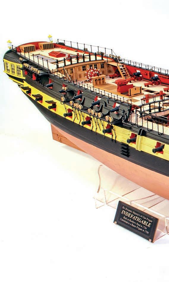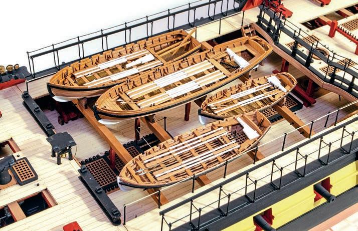 It had been many years since I’d tackled a coppered hull, and here 6mm wide selfadhesive copper tape would be used. A few bench sessions later and I had around 2,400 tiles to apply! Fortunately, I found this gentle repetition to be quite therapeutic. I initially added a silver waterline to the hull just below the actual level and then proceeded to copper to about 5mm above it, before adding the correct waterline in light pencil. A sharp knife was then run along the waterline and the excess copper above was peeled away. Et voila! The same process was employed for the rudder.