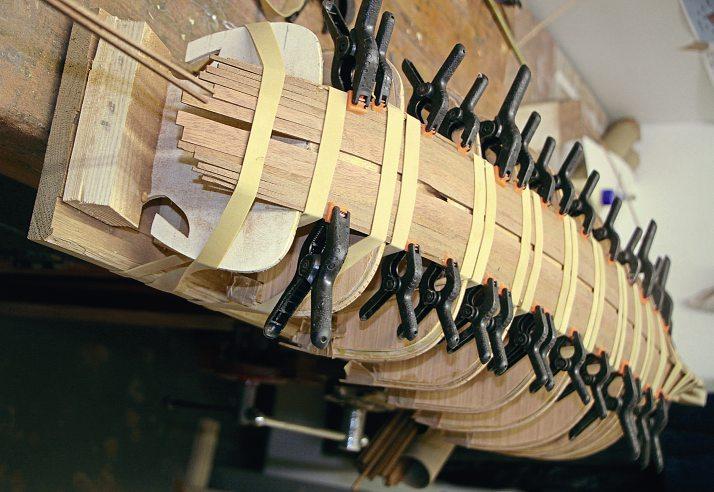 Thenexttaskwastheplanking.Thiswasto consistofnofewerthan646mmx2mm mahoganyplanksrunningthefulllengthof thehull,withnoinfillplanks,noendjoints, andallendingupatthegunwaleparallelto thegunwalecappingrail.Plankingstarted withthegarboardplanks,twoeithersideof thekeel,whichhadasteamedtwistatthe bow.Eachplankwouldbetaperedtoeach endusingaminiblockplane;here’show: Ameasurementwasverycarefullytaken fromthekeel/garboardplanktothegunwale ateachformer–1,1a,2,2a,3,3a,etc–and carefullynoted.