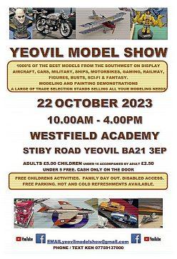 Thisyear’sYeovilModelShowwill takeplaceonOctober22between 10amand4pmattheWestfield Academy,StibyRoad,Yeovil,BA21 3EP.Admissiontoshow,featuring thousandsofmodels(includingboats, ships, etc)andalargenumberof tradestands,willbecharged(cash only)at£5foradultsand£2.50for accompaniedunder16s(therewillbe nochargeforchildrenunder5yearsof age).Freeparkingwillbeavailableand thevenueitselfiswheelchairfriendly. Hotandcoldrefreshmentswillbe servedthroughoutthedayandthere willalsobeplentyoffreechildren’s activitiesatthisfamilyfriendlyevent.