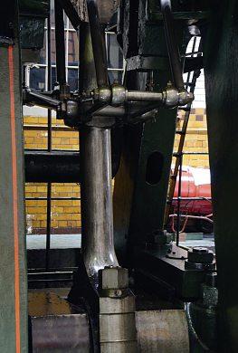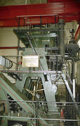 thecylinders.Thetwopistons weremountedonacommon rod.Steamenteredabovethe smallerpistonand lledthe upperpartofthesmallcylinder drivingdownthesmallerpiston and,withit,thelargerpiston. Asthelargerpistonreached itslowerlimititdepressedthe projectingspindleofavalve inthediaphragmallowing thesteamtopasstothe undersideofthelargerpiston which,byitsdifferentialarea, wassubjectedtoagreater forceandaccordinglytended torise.Atcompletionofthe up-stroketheprojectingvalve spindleofanothervalveinthe pistonmadecontactwiththe cylindertopcoverandopened thevalveallowingthesteam topassthroughthepiston tothesurfacecondenser. Becauseworkwasdoneon bothstrokestherewasno deadmotionastherewould havebeenwithasingle-acting cylinder.Ratherthanthe gearedtwin-connectingrod usedbyCartwright,Sadler’s engineemployedacrosshead andpairedrods anking thecylinderswhichconnect upwardswithatwo-throw crankshaft.