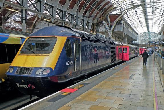 A First Great Western HS 125 diesel at Paddington station in 2016 just arrived from Bristol Temple Meads. 197 of Class 43 were built between 1975 and 1982. Capable of 125mph (201kph) there was a power car at each end of the train. ese trains have served East Coast, East Midlands, Grand Central, Cross Country and the Network Rail Measurement trains.