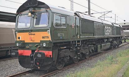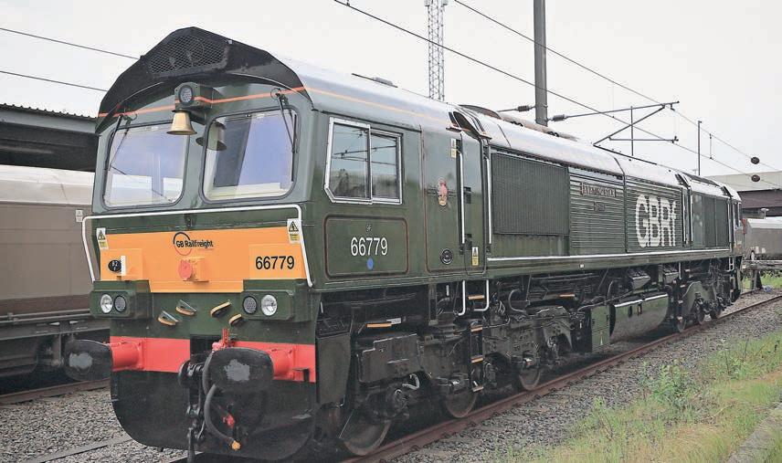 e last of 700 Class 66 No. 66779 manufactured by EMD in Illinois USA in 2015. It has nostalgically been named Evening Star after the last steam locomotive to be built for BR. It also displays the shed plate of 82F, Bath Green Park where it was last based. A traditional American warning bell is tted to both ends of the locomotive.