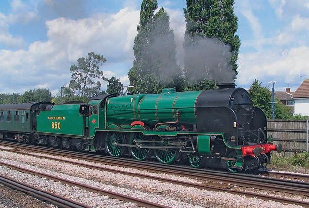 No. 850 Lord Nelson, designed by Richard Maunsell built at Eastleigh in 1925 and seen here in preservation pulling into Headcorn station, Kent in July 2007. ey were originally introduced for the boat train tra c to Dover and Folkestone.