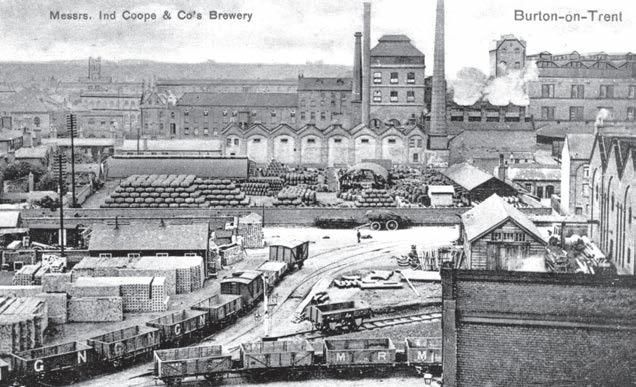 Brewery showing both Midland Railway and Great Northern Railway wagons with one on its own having bow ends and two covered wagons with sliding hatches. e Ind Coope brewery is at the back with tall chimneys with the wooden casks (barrels) in front. e signal in front of the single wagon is an early double arm type that would be manually operated to lower and raise each arm.