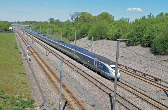 Eurostar trains are the international link between the UK and the rest of Europe from St Pancras station, down the HS1 line to Folkestone then under the English Channel to France, Belgium and the Netherlands. e service was started in 1994 and there are 11 Class 373 and 17 Class 374 train sets travelling at 199mph (320kph).