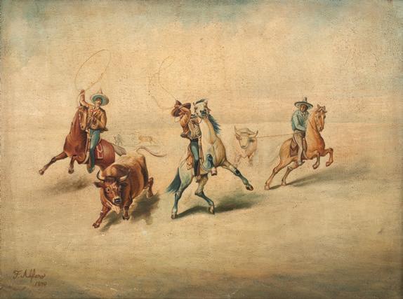 Francisco Alfaro es uno de los nombres más esquivos y, a la vez, más elocuentes de la pintura charra del siglo XIX. Mencionado por los estudiosos como antecedente directo de Ernesto Icaza, su obra se sitúa en el corazón de la tradición ecuestre y ganadera del México decimonónico. Aunque hoy es poco frecuente encontrar piezas suyas en el mercado, Alfaro fue un pintor de pincel prolífico y mirada precisa, dedicado a registrar con rigor las faenas rurales, los atuendos del charro y la dinámica del trabajo en las fincas del altiplano central. Más que una escena idealizada, su pintura funciona como crónica visual de un mundo en transformación.