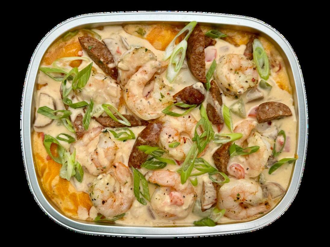 shrimp, andouille sausage, onion, peppers, cheddar, stone ground grits, smoked gouda cream sauce 54