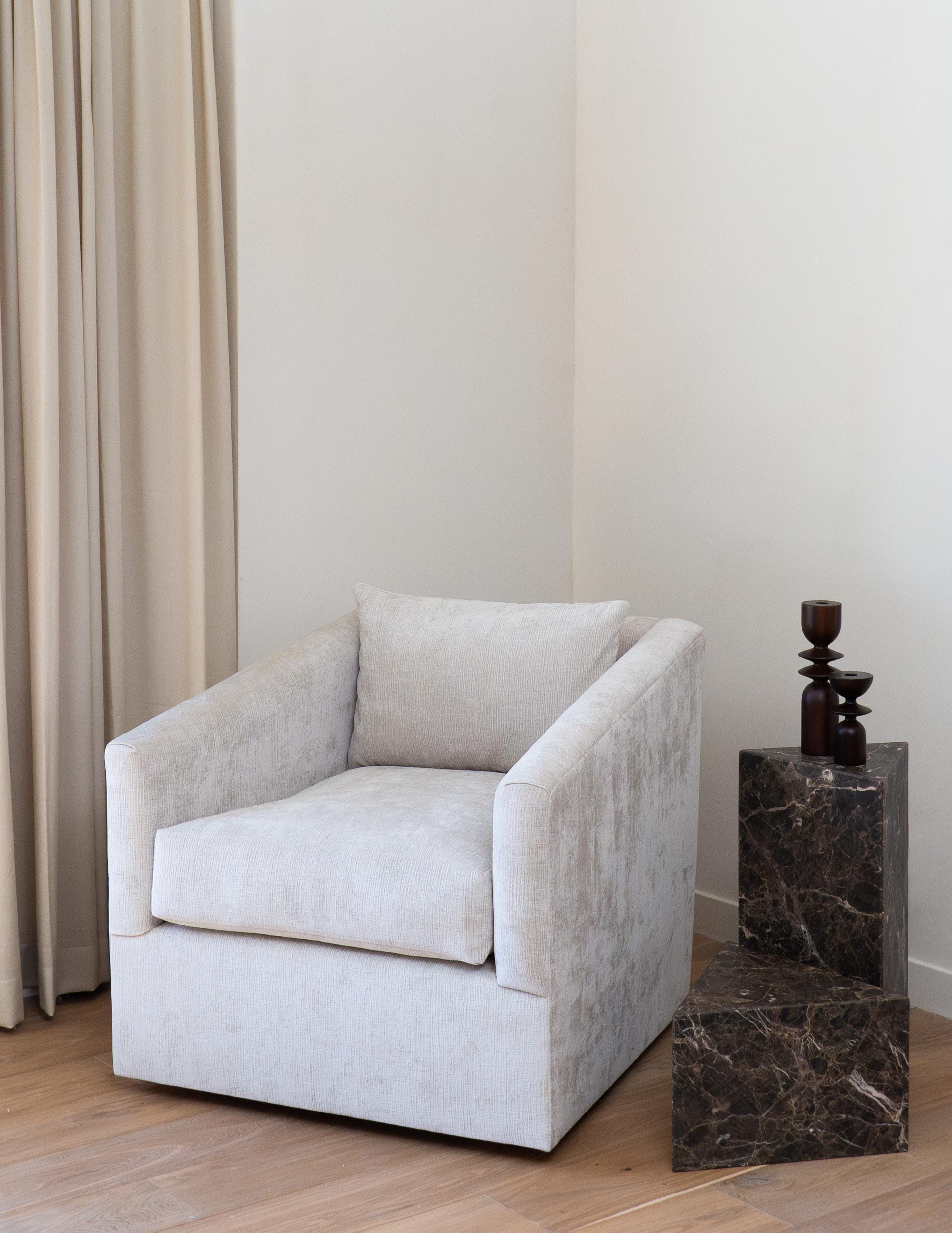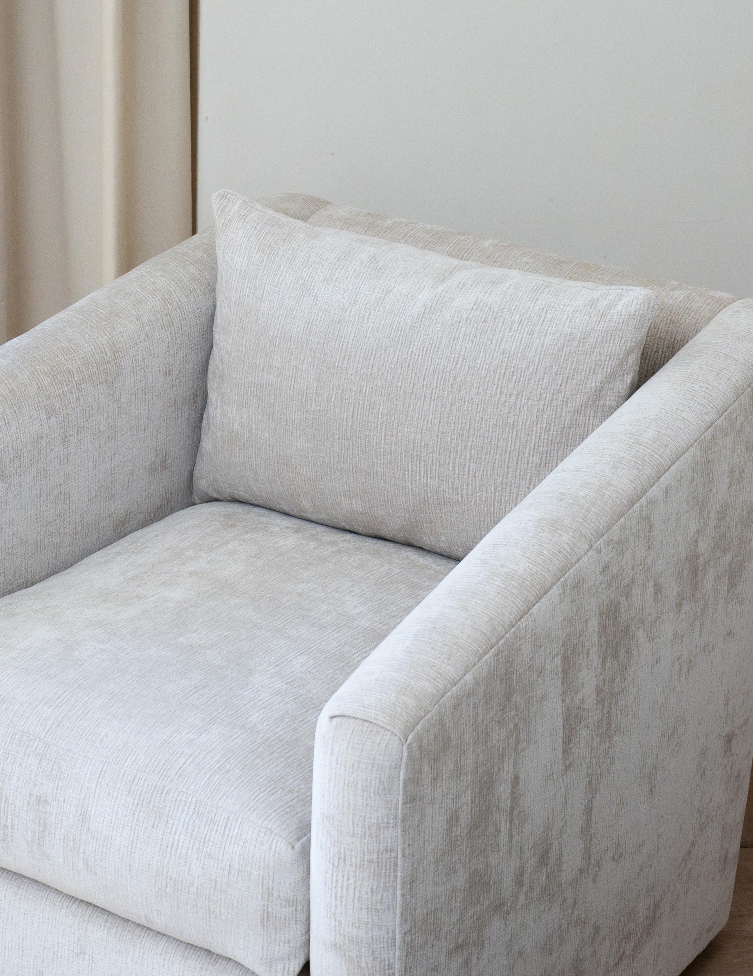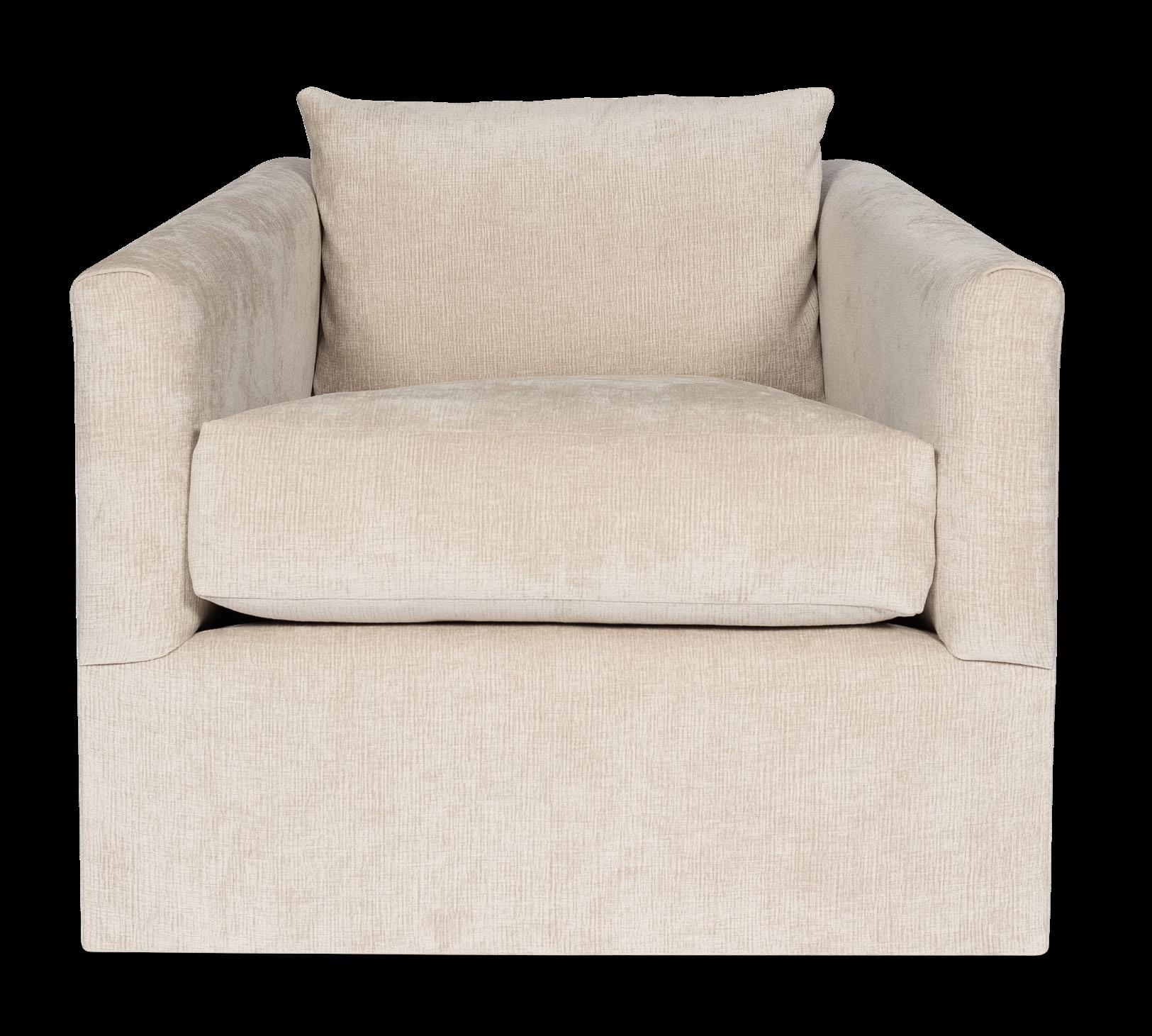 The Aston swivel chair is where transitional design meets endless comfort. With its angled arms and plush down feather cushions, this chair wraps you in a cozy embrace.