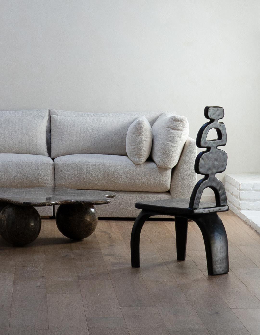 The Rocco chair boasts a bold, sculptural silhouette with smooth curves and a contemporary feel. Its low profile and plush seat make it a stylish yet cozy addition to any modern living space.