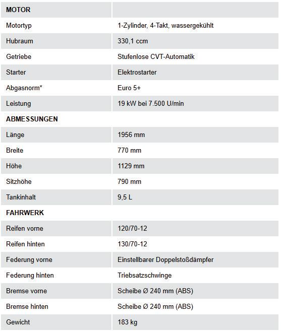 Flüssigkeitsgekühlter 330-cm³Automatikmotor.