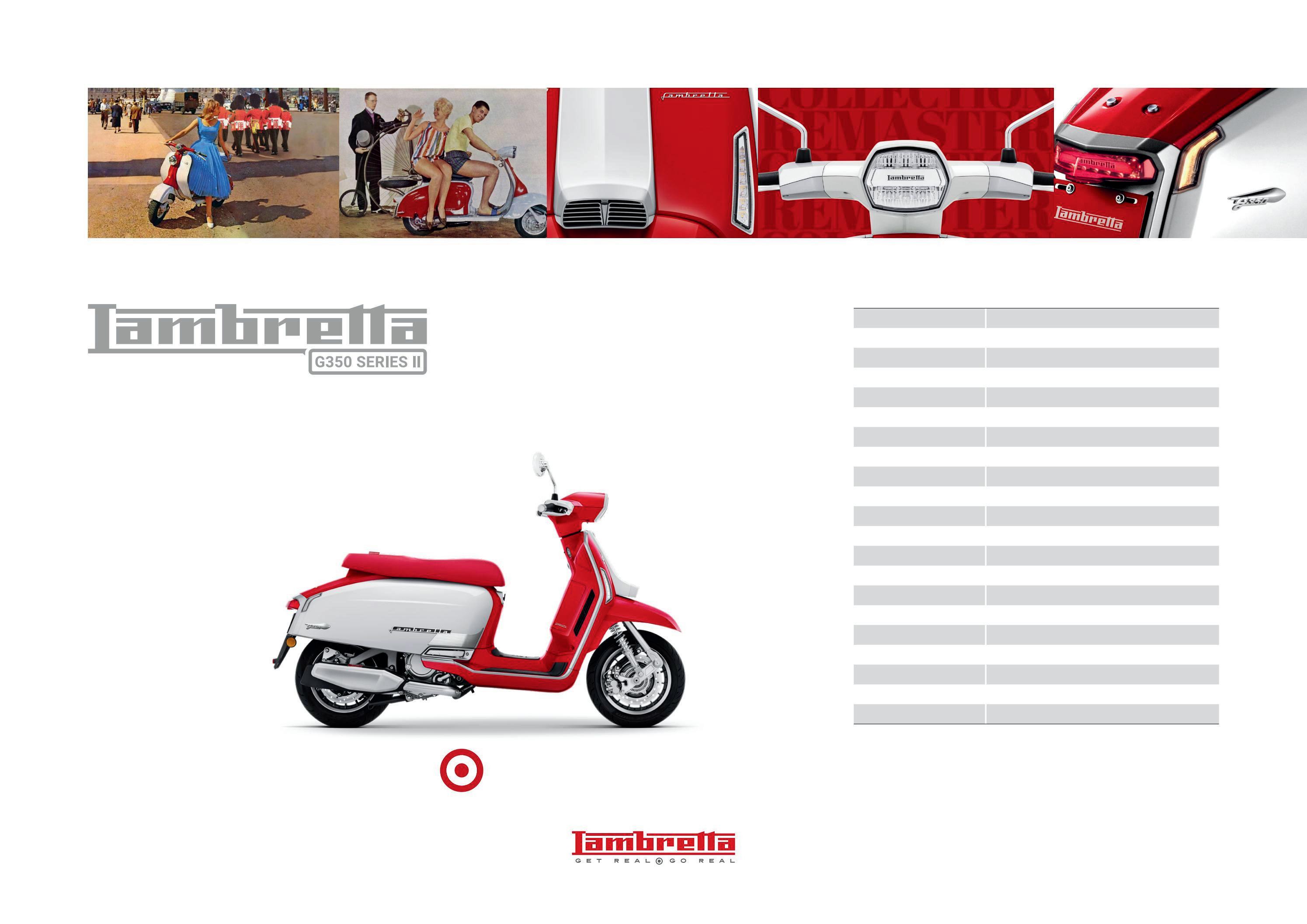 Lambretta GmbH se réserve le droit de modifier à tout moment et sans préavis, les spécifications techniques, équipements et couleurs des véhicules décrits dans ce catalogue.