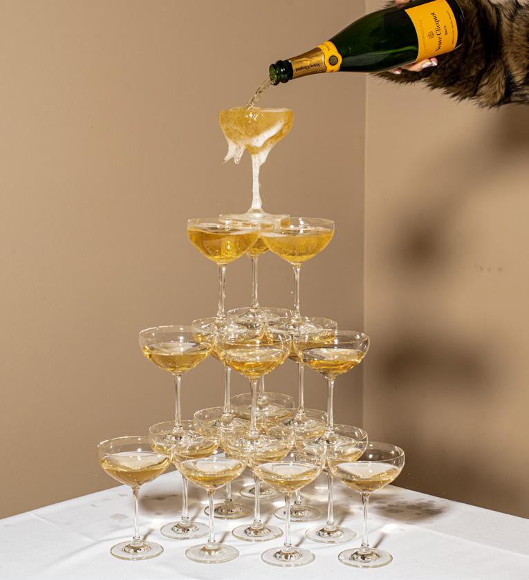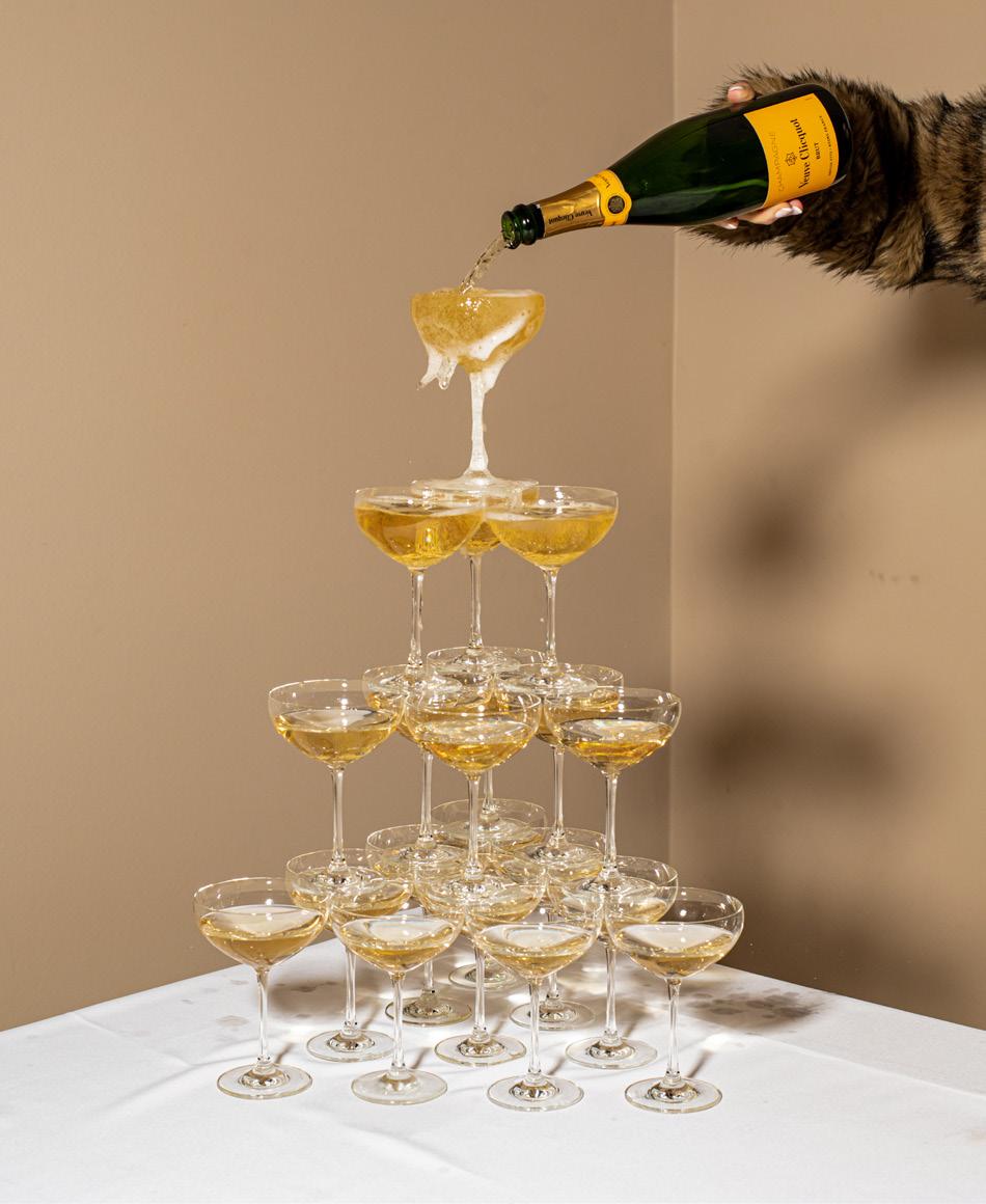 4. Pour slowly into the top glass, letting the champagne overflow and fill the layers beneath.