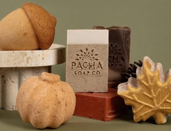 PACHA SOAP CO. BATH BOMBS & SOAPS — Scents like Sugar & Spice or Peppermint Twist bring seasonal luxury to the bath, made with clean, nourishing ingredients.