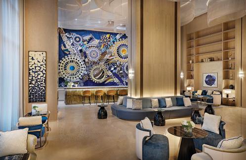 shouldn’t miss dining at Jackie (an ode to the former First Lady), The St. Regis Riyadh’s elegant interpretation of an all-day dining restaurant. Flooded with natural light and dressed in calm hues of white and blue, marble floors, mirrored walls, and triple height ceilings create a space that’s bright and inviting. For dinner, the culinary focus of Jackie strays from the brand’s American DNA to o er a largely Greek menu, with options like slow braised octopus with cherry tomatoes and capers, a board loaded with traditional mezedes, and prettily plated fish and meat for mains, all of which are generous portions and served on gold plated chinaware.