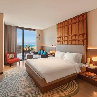 SO/ Ras Al Khaimah has 257 rooms and suites, all with sea views, with seven room categories available. Interiors are by Kristina Zanic Consultants. Inspired by a conceptstore approach, the design integrates elements of art, fashion, retail, and dining. The palette – sunset orange, ocean blue, and natural green – references