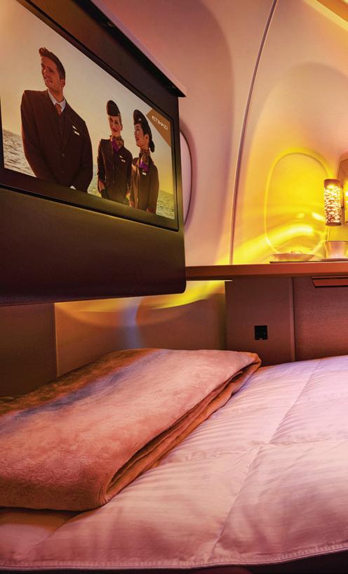class seat into a suite with sliding doors, finished in a palette of soft gold trims, cream textured walls and subtle ambient lighting set off by Etihad’s silhouette-casting lamp. The square foot is naturally smaller than the airline’s widebody products, but the extra space in these front-row seats lifts it above business class.