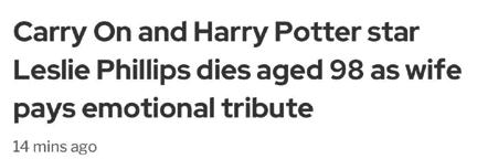 The word ‘as’ indicates at least a degree of concurrency and should be used with caution in headlines. Something an unfortunate sub-editor might have forgotten when she wrote this sell about the passing away of actor Leslie Phillips. We suspect his wife might have actually reserved her tribute until after her husband’s demise.