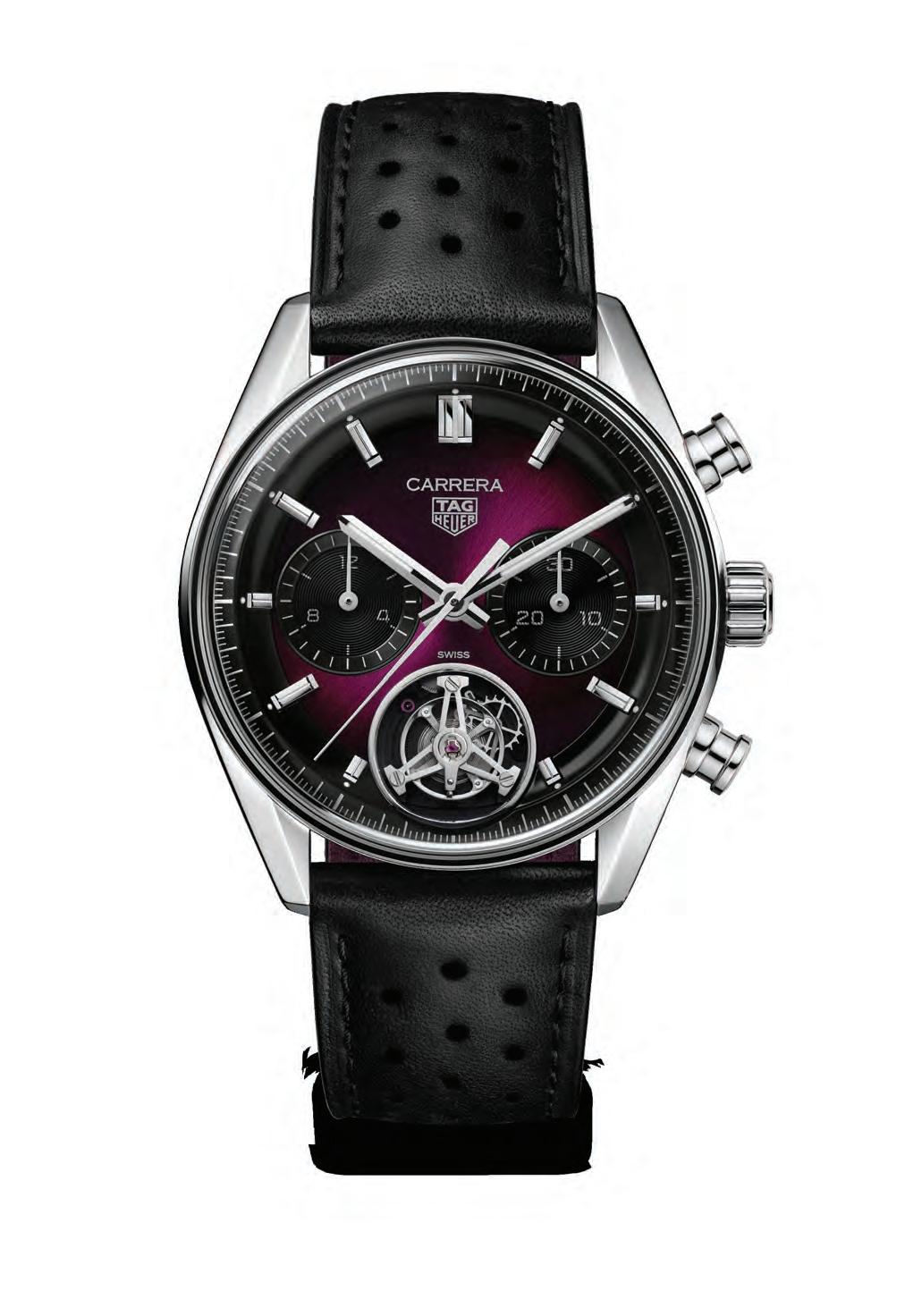 The TAG Heuer Carrera Chronograph and TAG Heuer Carrera Chronograph Tourbillon give collectors a fresh perspective on the depth of the Glassbox design: a striking smoky black-to-purple gradient dial, giving dimensionality of the design and making this watch a bold statement on the wrist. Rhodiumplated hour markers, along with silver accents, bring a refined but understated elegance to the timepiece.