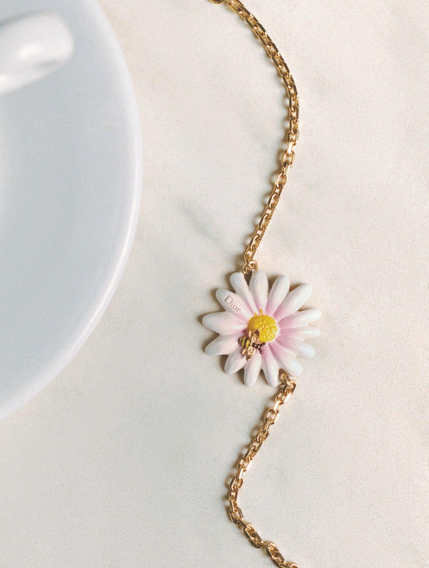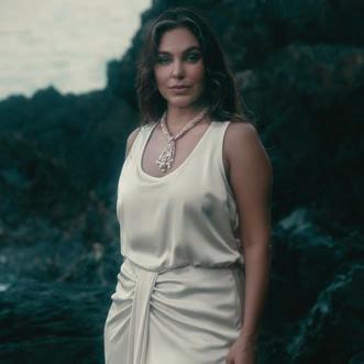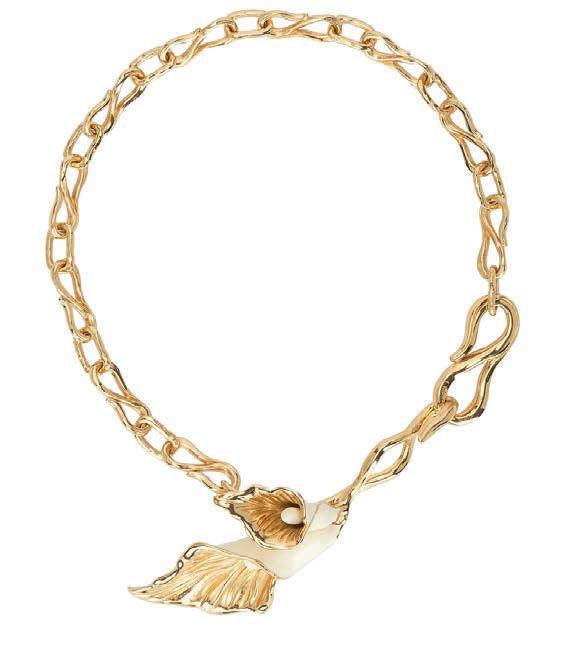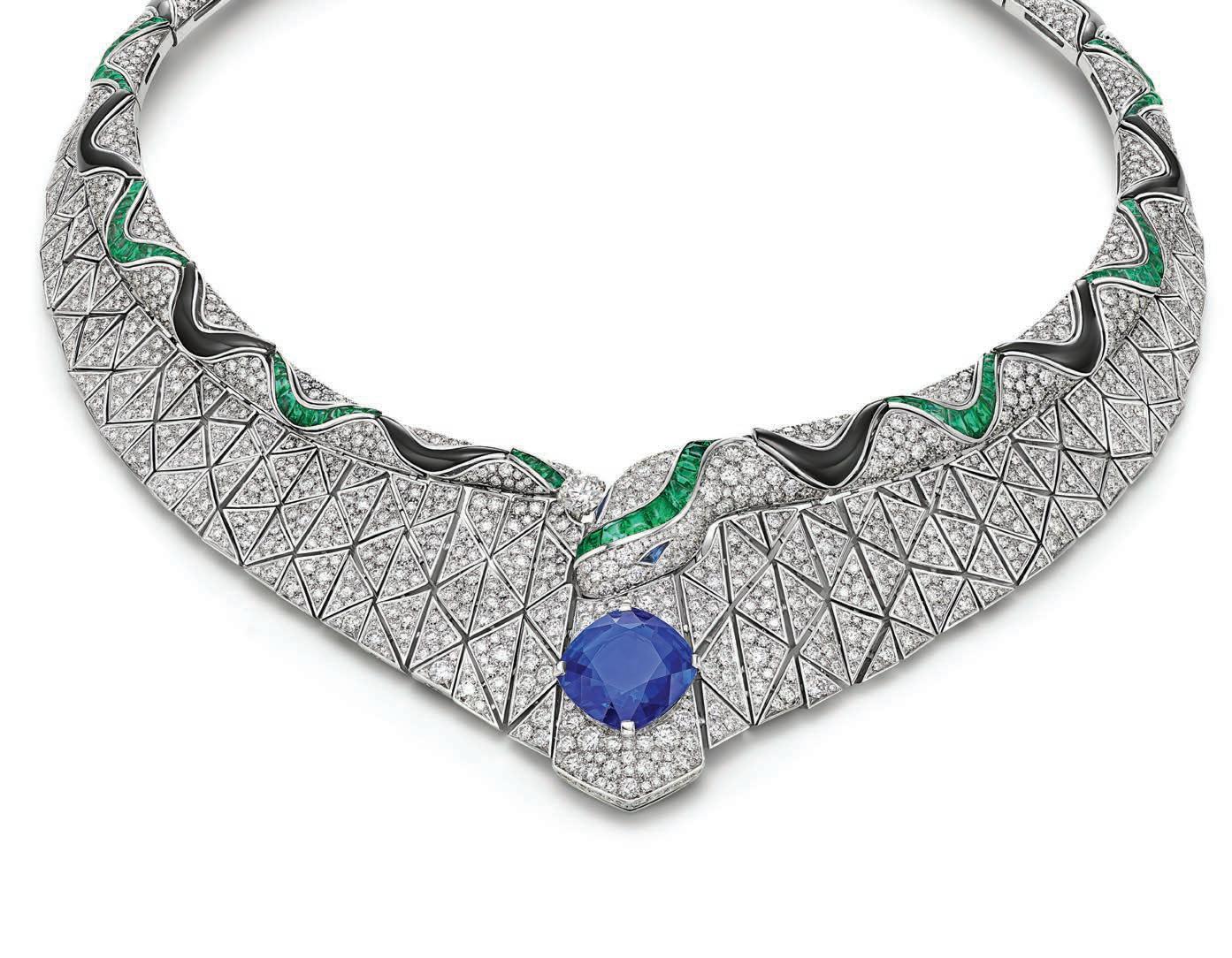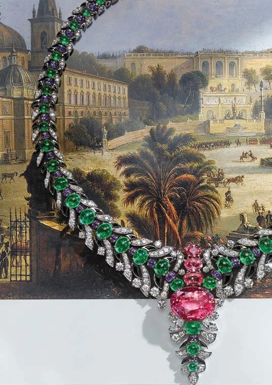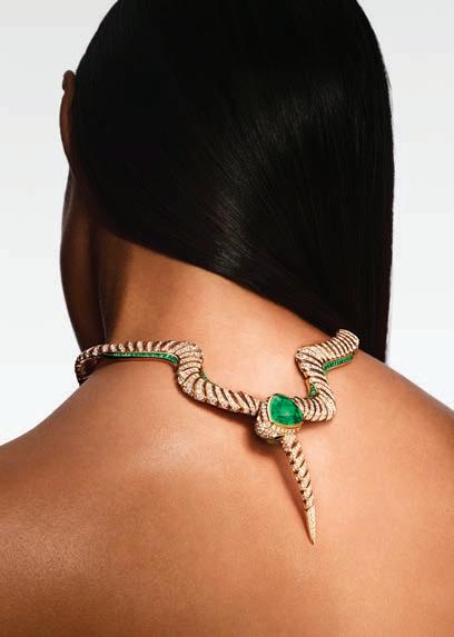 Top left: Bvlgari Secret Garden Necklace-Padparadscha sapphire; Top right: Outfit: Valentino; Jewellery: Buccellati