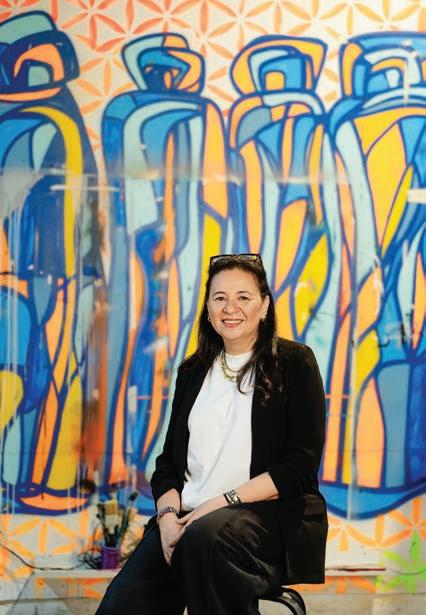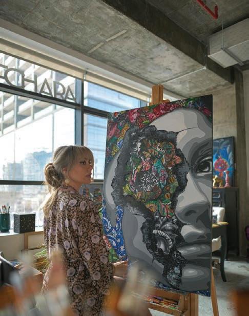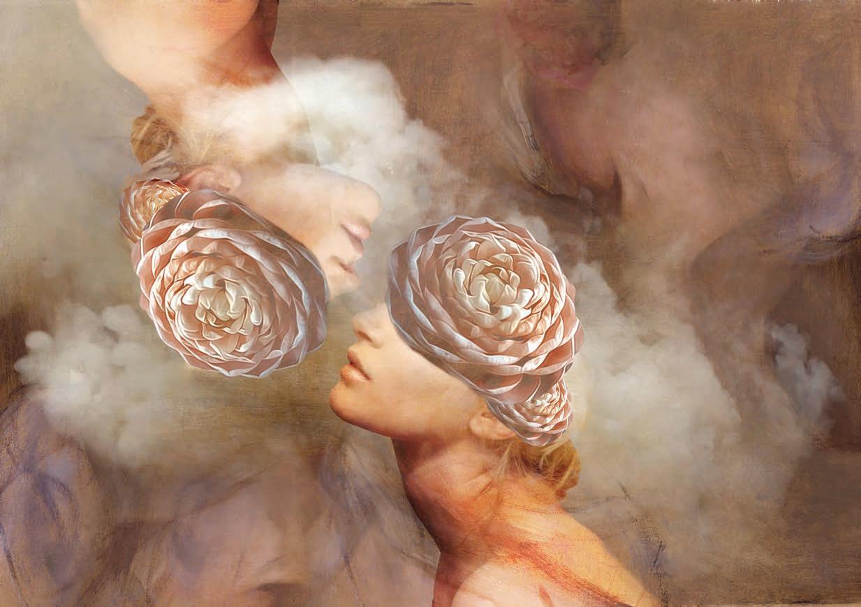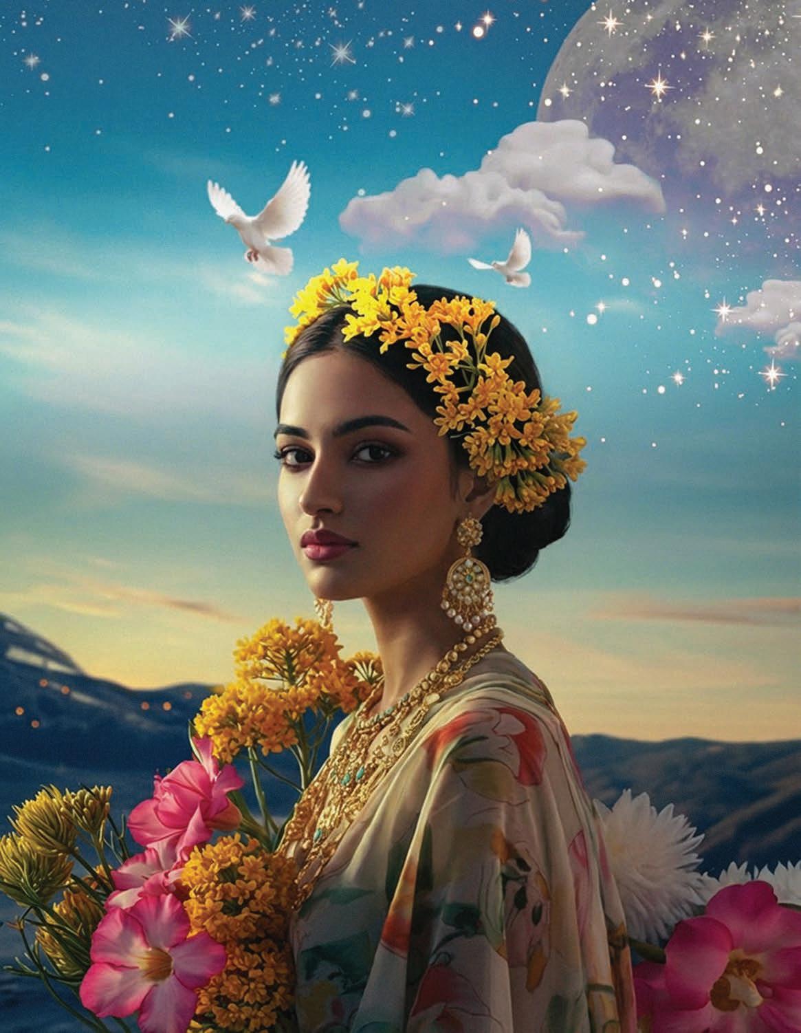 her if she would be open to creating a piece of artwork for a digital cover of the magazine. Famous for using women as inspiration for her computer-generated collage creations, her work dovetails perfectly with the foundational concept of this issue. I gave her a simple brief – that the cover feature a woman surrounded by the national flowers of the countries of the Middle East. Her interpretation of that idea can be seen on our digital cover and in the Through Her Eyes feature (page 74) about Al Suwaidi.