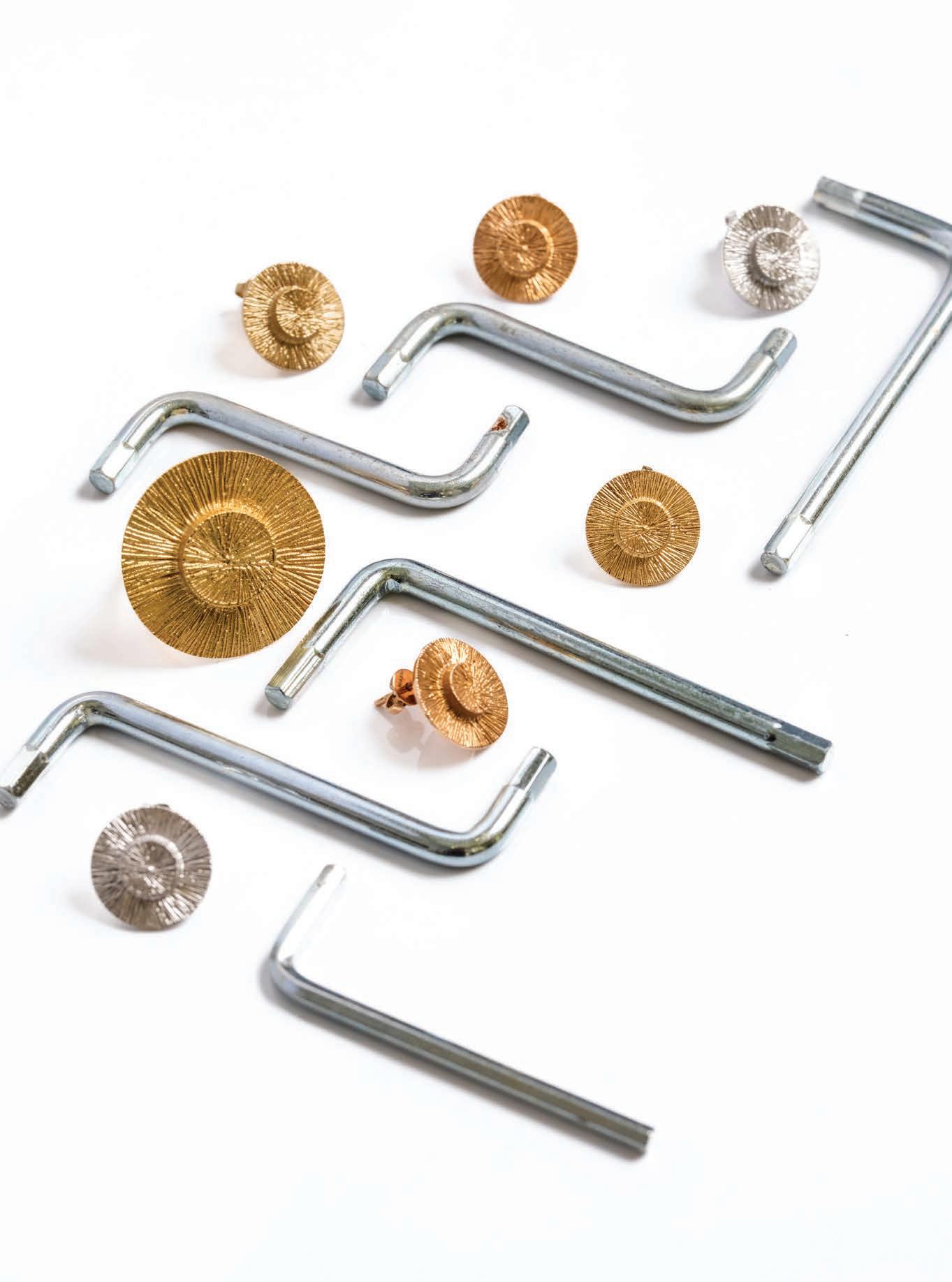 Bhavya Ramesh’s jewellery looks like it was designed for people who treat dressing as a full-body storyboard. She works heavily with 14kt gold-plated brass and silver, but the real signature is form: exaggerated nails and finger extensions, spiky ear cuffs,