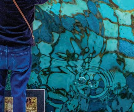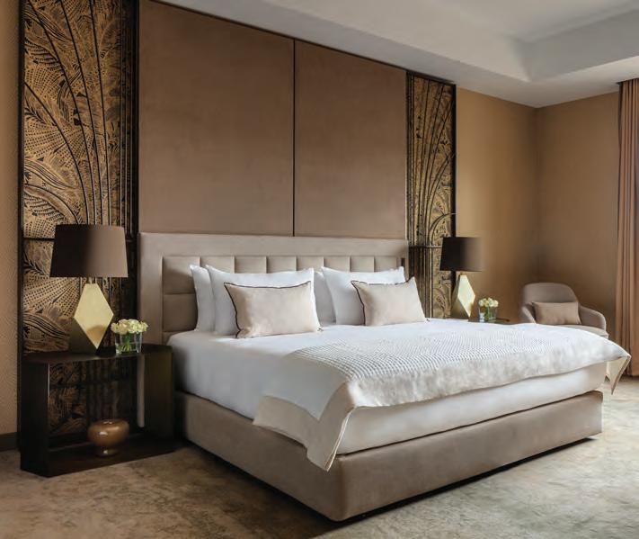 A stay in a deluxe suite comes with ample space to spread out. After a day amassing over 20,000 steps on the fashionable New Bond Street, Regent Street and Saville Row, we welcome relaxing afternoons in the lounge, where a palette of cream, bronze and delicate blue sets the tone for a space that is both sophisticated and inviting. Abstract artworks, hand-painted wallpaper, wellchosen coffee table books and a minibar laden with sparkling crystal glassware adds both personality and practicality.