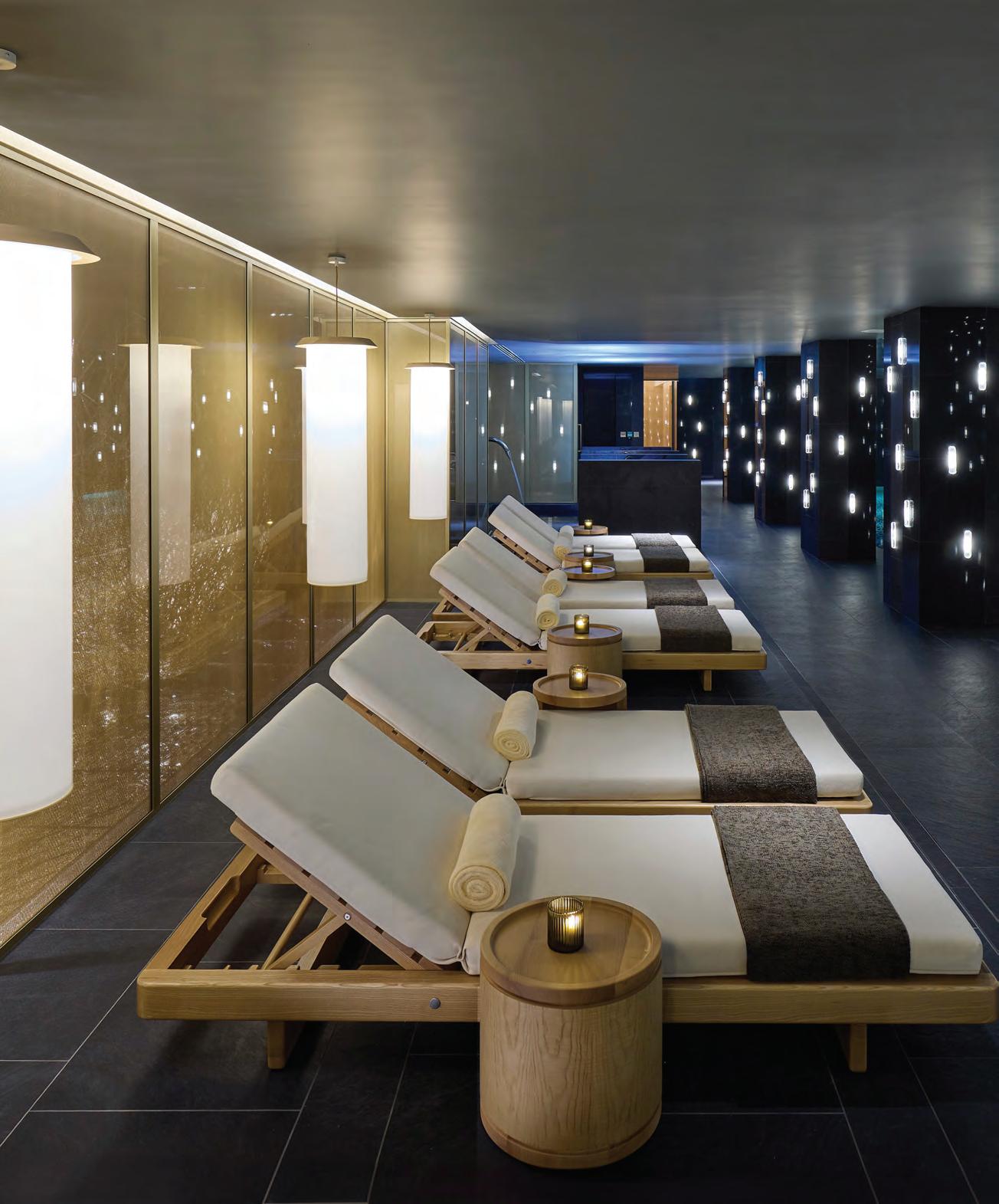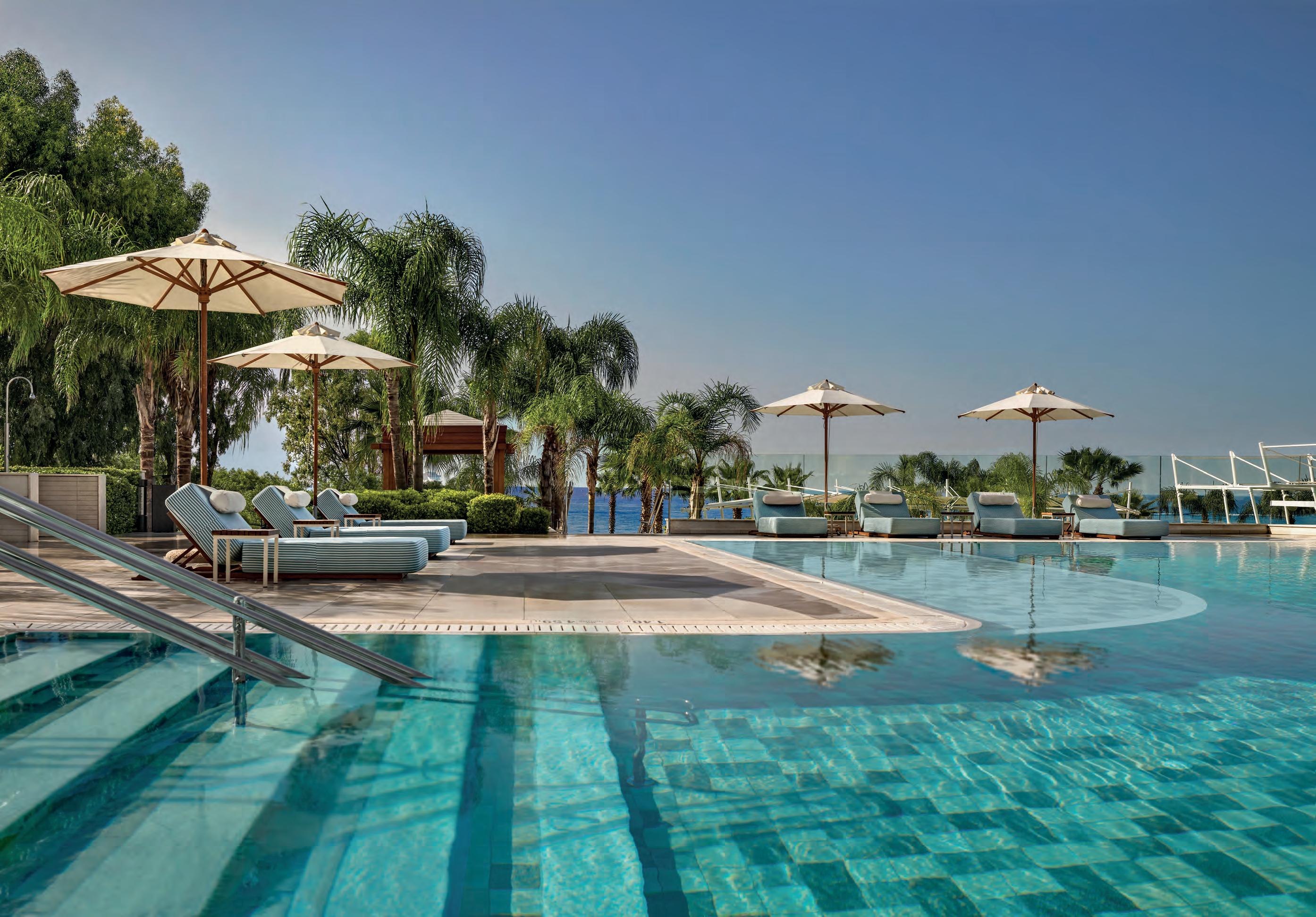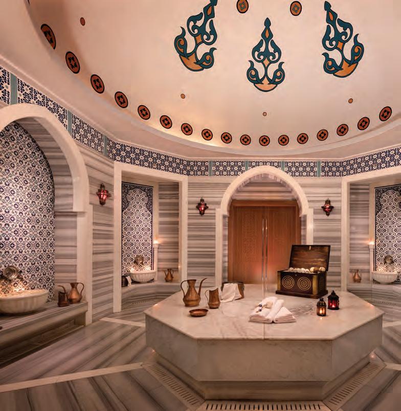 living spaces rather than afterthoughts: oversized tubs, walk-in showers, clean lines, and generous mirrors that create an intentionality to give space for daily rituals to feel unhurried. The presidential suites extend this sense of ease even further. With separate lounges, dining areas, and walk-in wardrobes, they resemble private apartments more than temporary accommodations. But perhaps the most profoundly relaxing aspect of the hotel is the one that lies beneath the palace itself. A reserved elevator signals a shift in temperature and scent, as essential oils linger in the air. Designed like a network of caves inspired by the Greek archipelago, the underground spa unfolds as a cocoon carved beneath the earth – a private refuge. The pool glows in deep, muted blues. The Finnish sauna releases heat in steady waves, while the aromatherapy steam chamber feels as if it clears the soul with unexpected ease. Here, in this quiet refuge, the rhythm of the bustling city above grows still – calmed by a sanctuary dedicated to the noble pursuit of wellness.