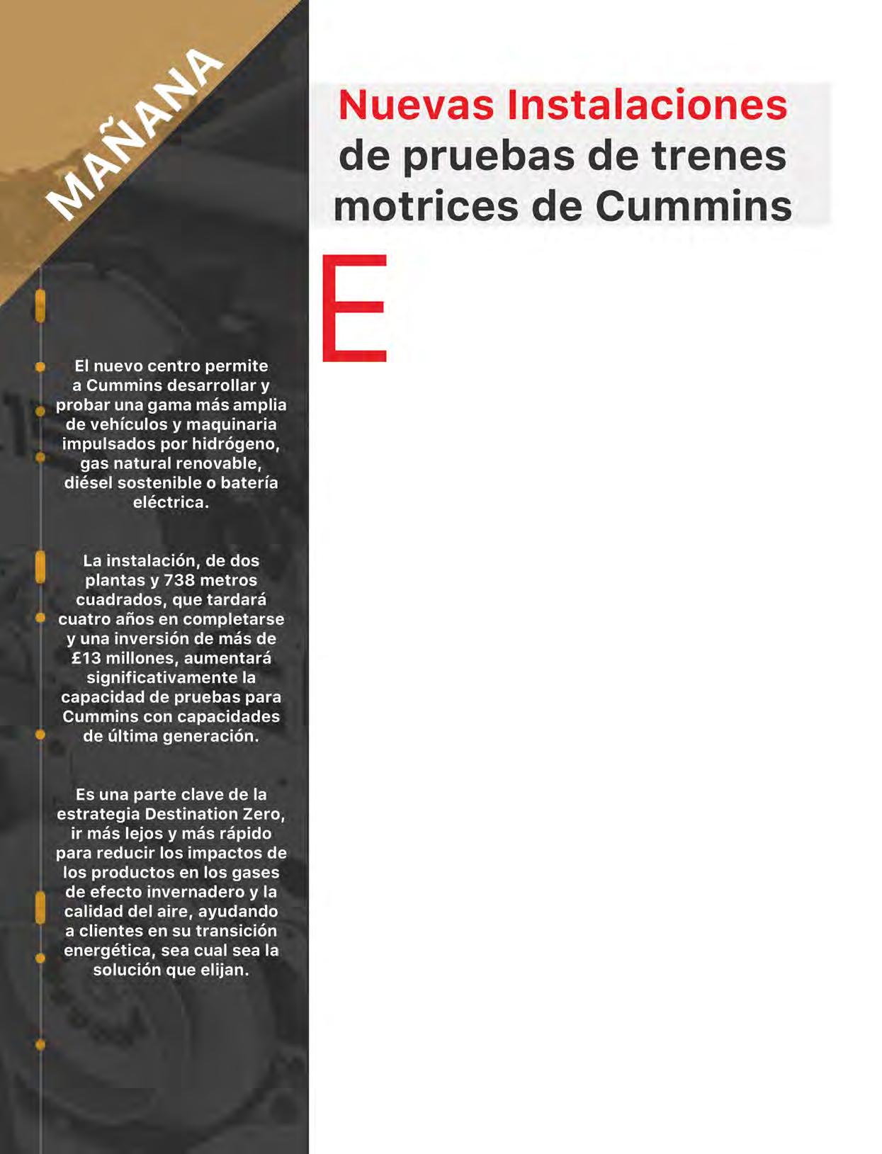 l Centro de Pruebas de Trenes Motrices es una expansión ya considerada por el área de Operaciones Técnicas Europeas de Cummins que le permitirá desarrollar y probar una gama más amplia de tecnologías energéticas, desde plataformas de motores de combustión independientes del combustible con capacidad para diésel, gas natural e hidrógeno de última generación hasta celdas de combustible de hidrógeno y sistemas de propulsión de unidades eléctricas de batería, allanando el camino hacia lograr cero emisiones en toda su cartera de productos.