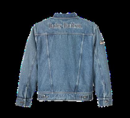 Outer-layerstylehonorslegendarymotorcycleracinginourLimitedEdition PowerslideOversizedDenimJacket.Cutfromheavyweightcottondenim,spray washedforawell-wornvibe.Itsoversizedtruckersilhouettefeaturesattractive topstitchdetail,anadjustablewaistband,andahiddensnap-downcollarthat staysputwhileyouride.Thiswomen’sdenimjacketisadornedwithan embroideredappliquémixthathonorsHarley-Davidson’sracinglegacy.Infact, the#1Logoonfrontwasoriginallycreatedin1969tocelebrateourAMAGrand NationalChampionshipseasontitle.
