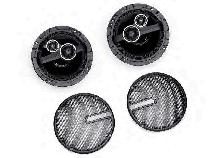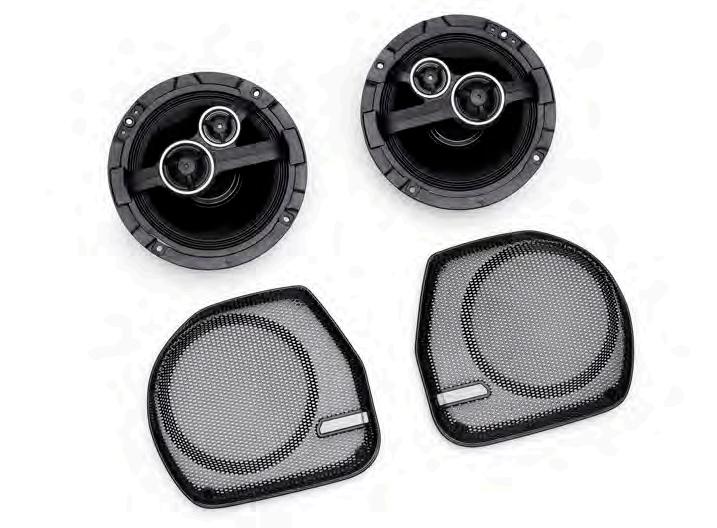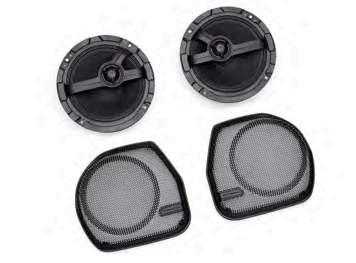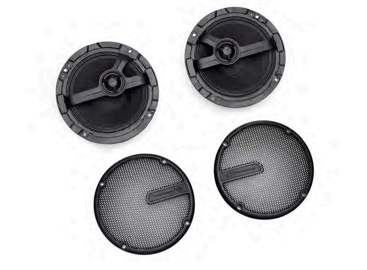 Amplify your audio experience with HarleyDavidson® Audio powered by Rockford Fosgate® Stage I speakers. These highperformance two-way speakers feature a durable injection molded woofer and a separate bridge-mounted tweeter. Each speaker is rated to handle up to 75 watts of power, and with two amplifiers up to eight speakers can be installed in a single system. Designed to fit perfectly in the Original Equipment speaker housing, each kit includes Left and Right speakers and custom grilles with a black badge. These speakers deliver a significant upgrade in sound quality and power over the Original Equipment components. Garage-ready installation.